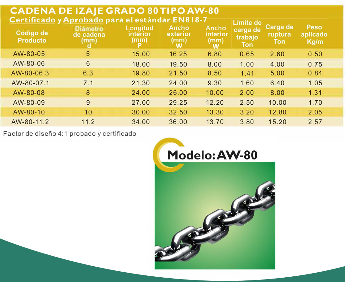 Cadena de izajes de grado 80 tipo AW-80