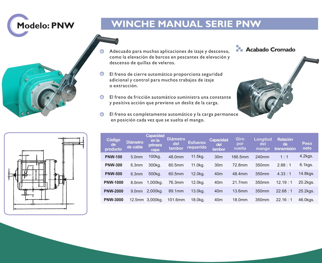 Winche Manual modelo PNW con acabado cromado.